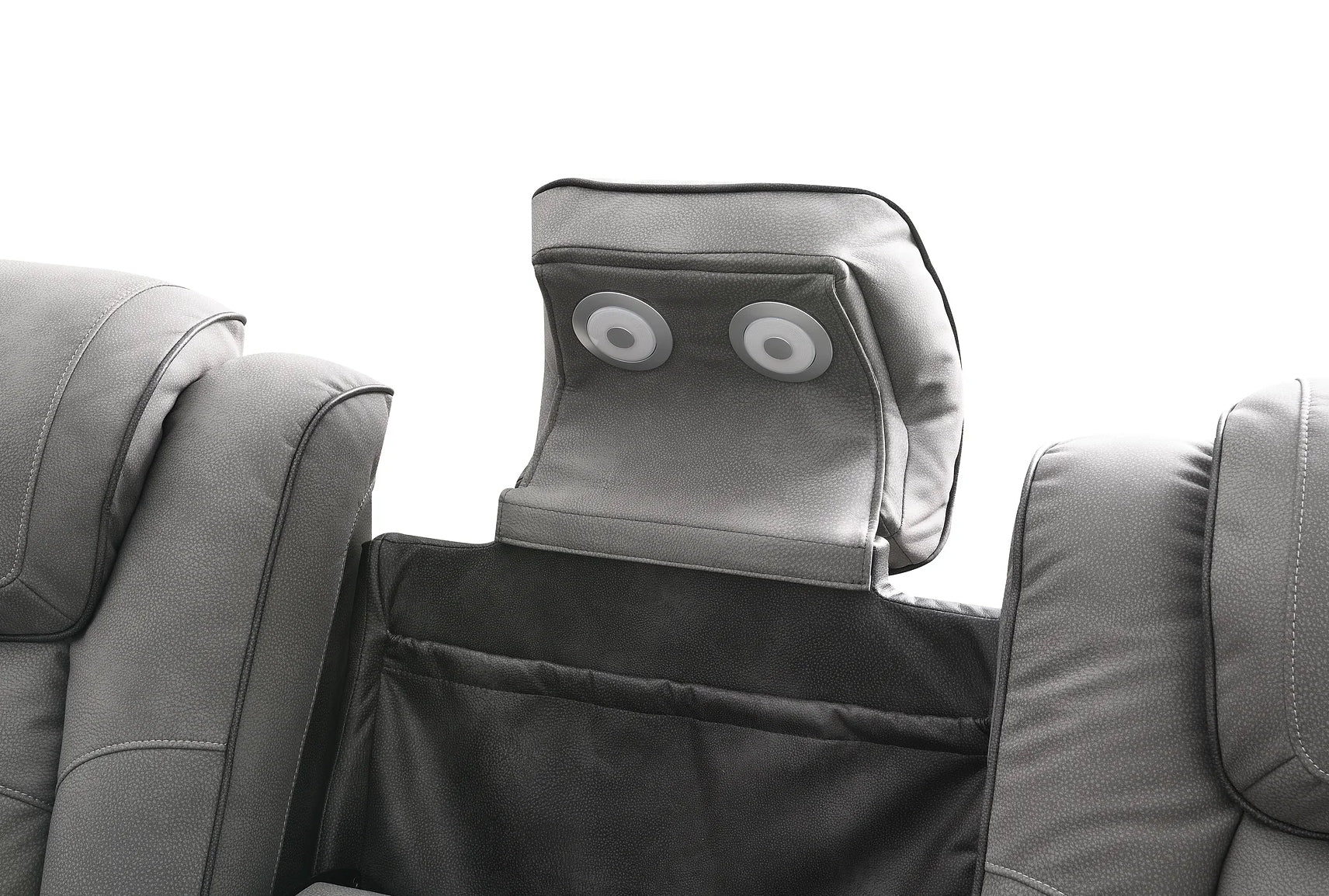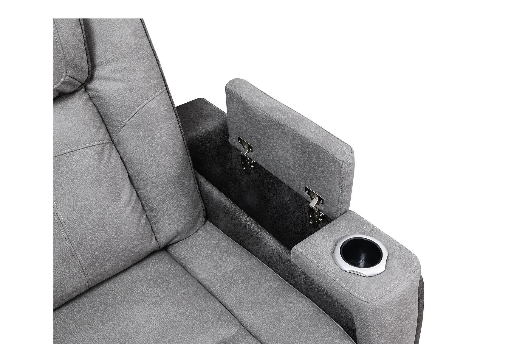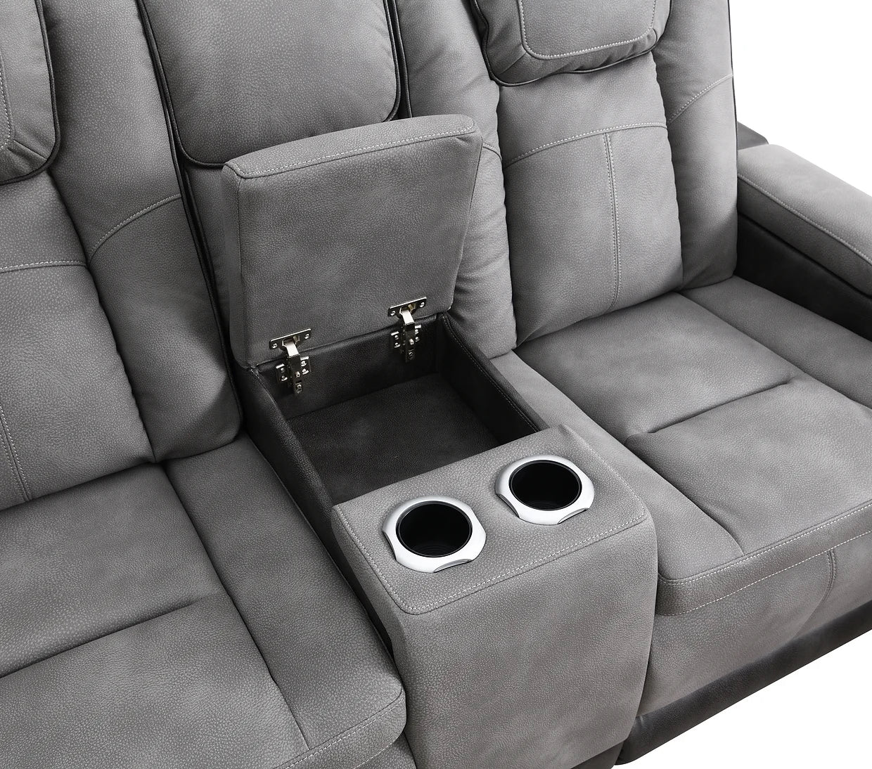 This sleek, ultra-modern power reclining set has it all. With designer looks and head-to-toe comfort, the reclining sofa with drop-down table has the upscale look of leather at a scaled-down faux leather price. Its two-tone upholstery is more durable and water-repellent than regular leather, an added bonus for families with children or pets. Features including wireless and USB charging, an adjustable headrest and an extended "zero-gravity" ottoman for improved circulation make this the next generation of power recliners.