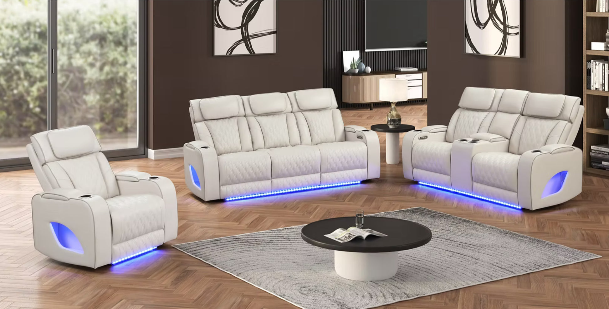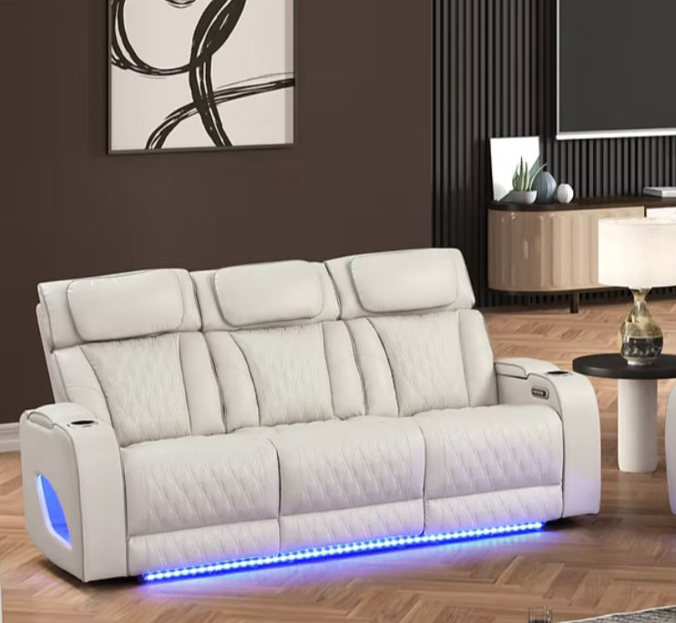 - Sofa features a drop-down table with LED reading lights, an A/C power port, cup holders, USB ports.