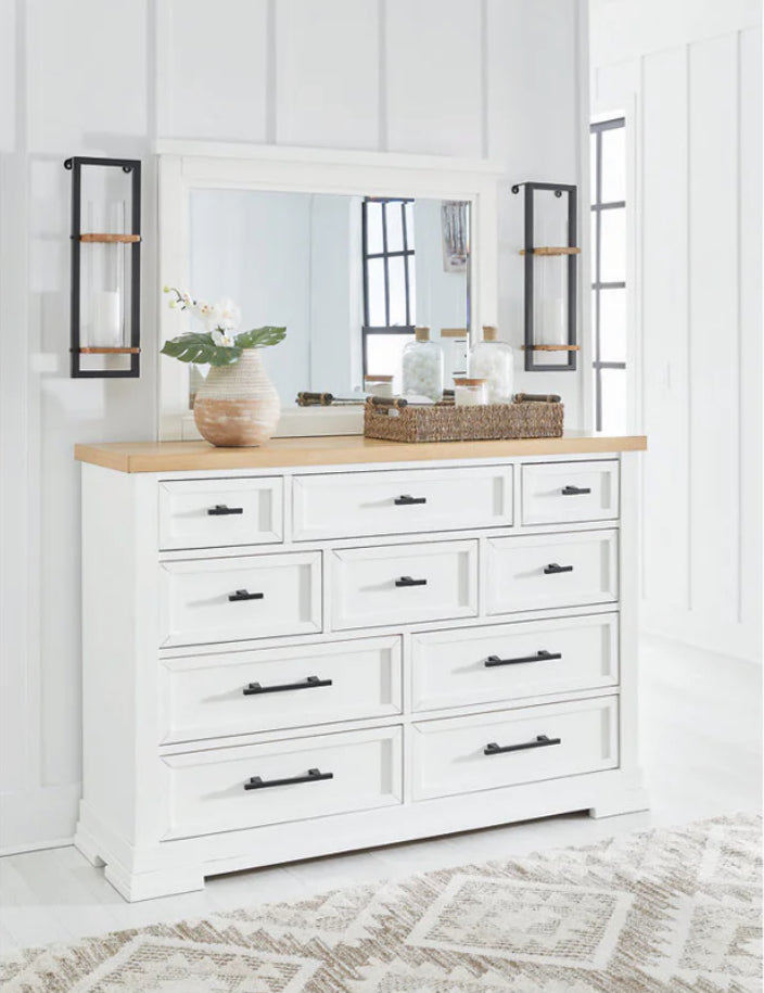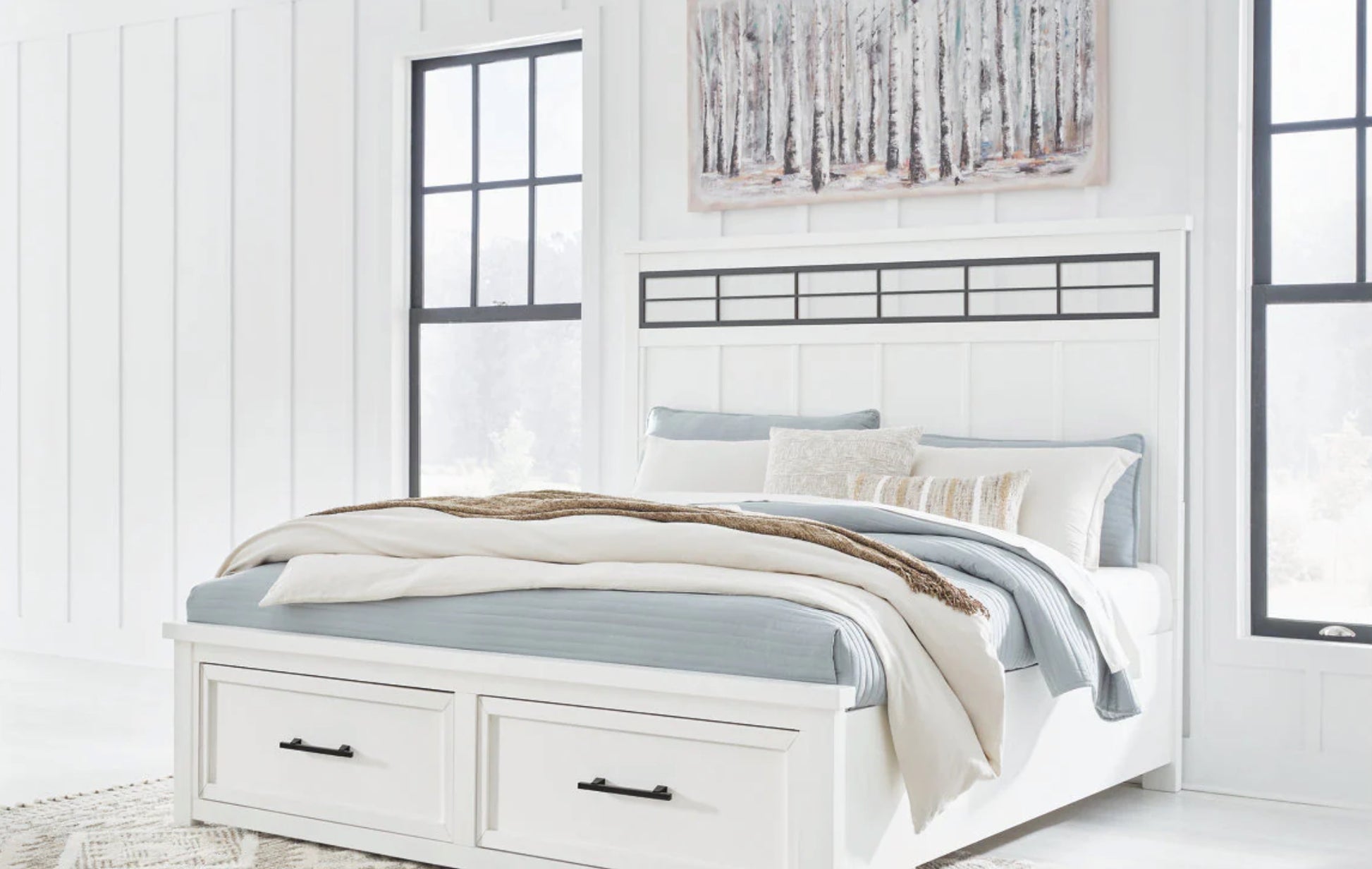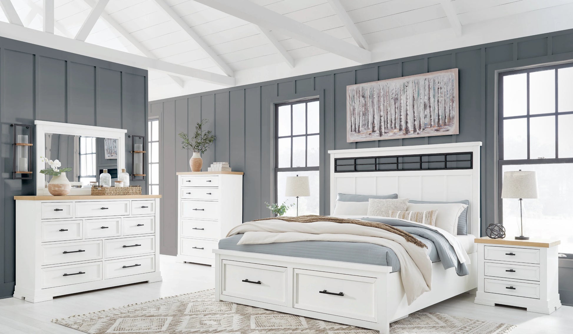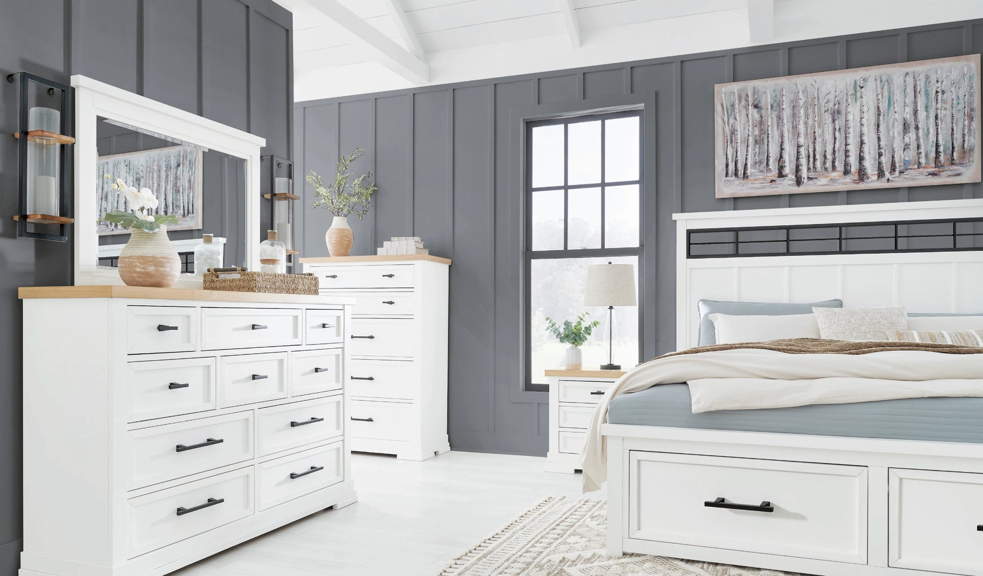 Part of the ASH Collection by Ashley Furniture, this panel storage bedroom set offers a blend of casual style and functionality. Crafted from hardwood solids, MDF substrates, and butcher block oak veneer, the bed features a distinctive inset metal detail on the headboard, adding a unique touch to its modern farmhouse design. The sturdy silhouette, white and natural finish, and matte black pulls create a cozy ambiance in your bedroom. The set includes Queen bed, Dresser, Mirror and nightstands with spacious drawers, and a bed with storage drawers featuring dovetail construction and ball-bearing side glides for durability. The nightstand boasts three drawers, a 110V power supply, dual USB charging ports, and a power cord for convenience. With its thoughtful design and quality craftsmanship, this bed set is both stylish and practical for a relaxing bedroom retreat.
